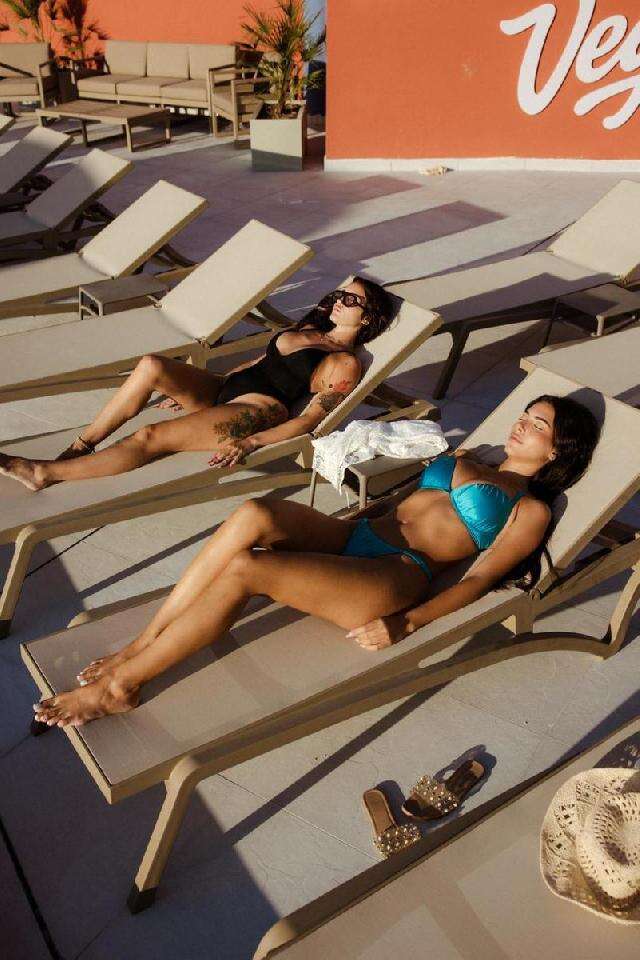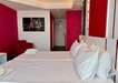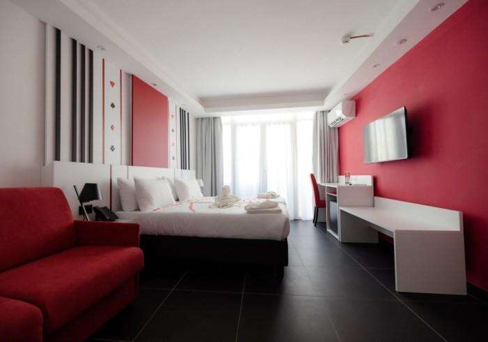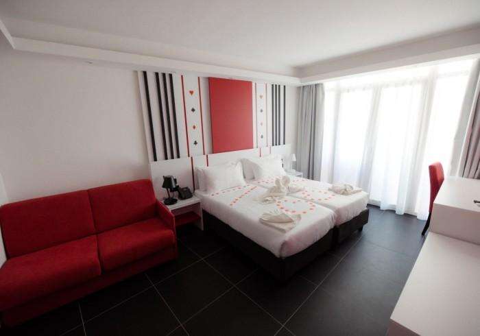 Kétágyas standard medencére néző szoba: élénk színek, king-size ágy, pihenősarok piros fotelekkel és LED világítással. mindössze pár lépésre az éjszakai élettől. Max 2 fő befogadására alkalmas.